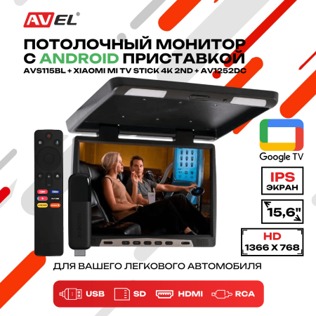Потолочный монитор на Android AVS115BL + Xiaomi TV Stick 4K + AV1252DC