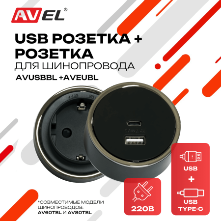 Комплект из двух трековых розеток черного цвета (USB розетки AVUSBBL и евро розетки AVEUBL) для создания трековой системы розеток в доме или офисе. Они вставляются в шинопровод, который приобретается отдельно, и получают питание через контакт. Розетки можно передвигать по всей длине трека. Купить шинопровод длиной 60 или 80 см, а также дополнительные розетки можно в нашем онлайн-магазине.
