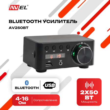 Если вы решили создать акустическую систему в одной из комнат, то рекомендуем обратить внимание на усилитель звука для домашней акустики AVS250BT. Он компактен и устанавливается на любую открытую поверхность: стол, тумбочку или полку. На передней панели также есть кнопки для удобного и быстрого управления устройством и небольшой информационный экран.