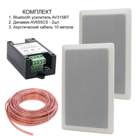 Комплект из двух потолочных динамиков, усилителя и акустического кабеля AV315BT + 2xAV655CS + AV10AC