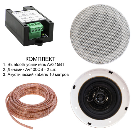 Комплект из двух влагозащищенных динамиков, усилителя и акустического кабеля AV315BT + 2xAV400CS + AV10AC