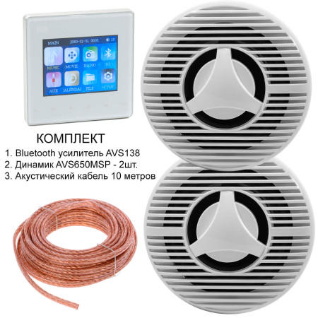 Комплект из двух влагозащищенных динамиков, усилителя и акустического кабеля AVS135 + 2xAVS650MSP + AV10AC
